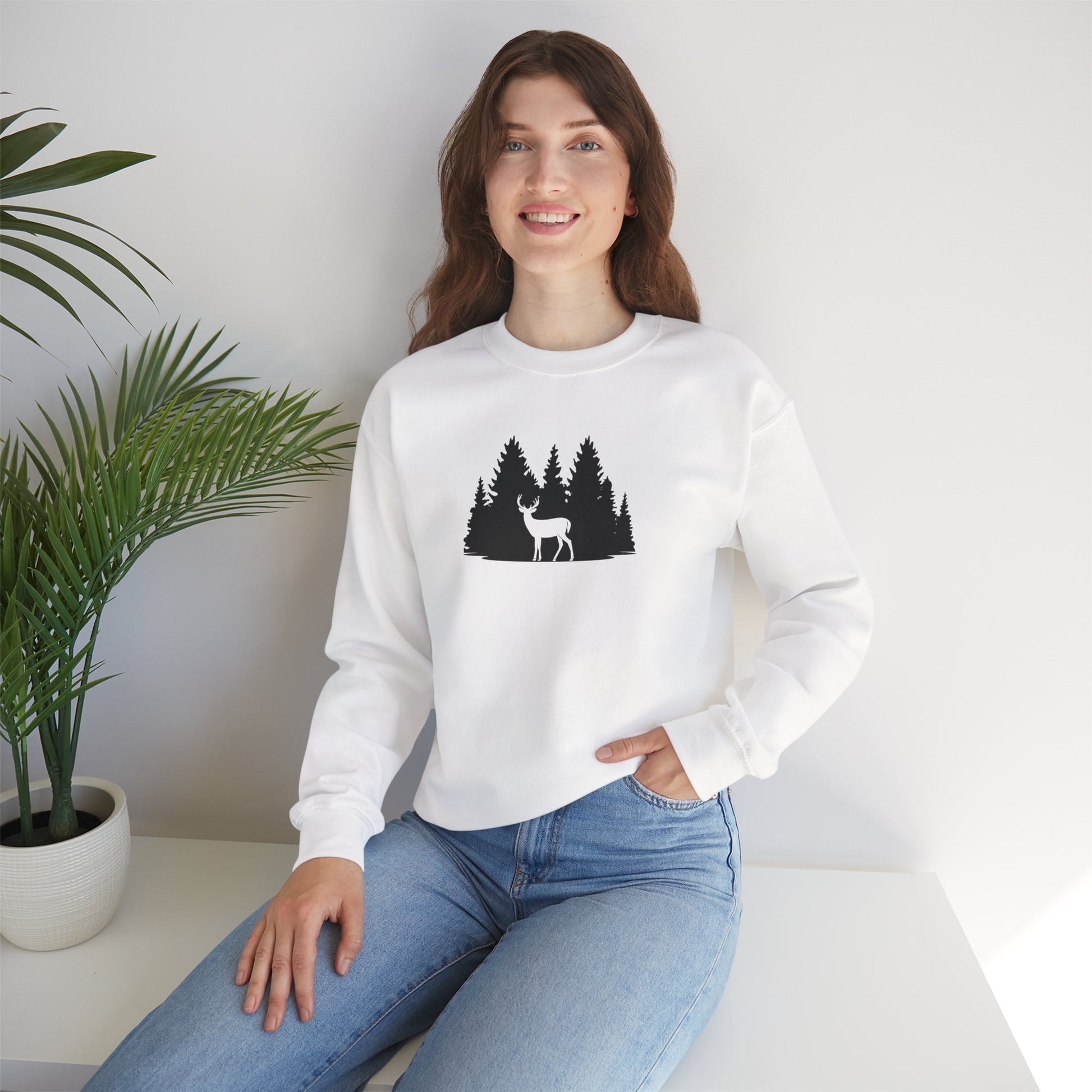 Inspired by the quiet stillness of the forest, this sweatshirt captures a single deer standing among tall pine trees — a reminder to slow down and breathe. Designed in minimalist black line art, it pairs clean simplicity with a touch of nature’s calm.