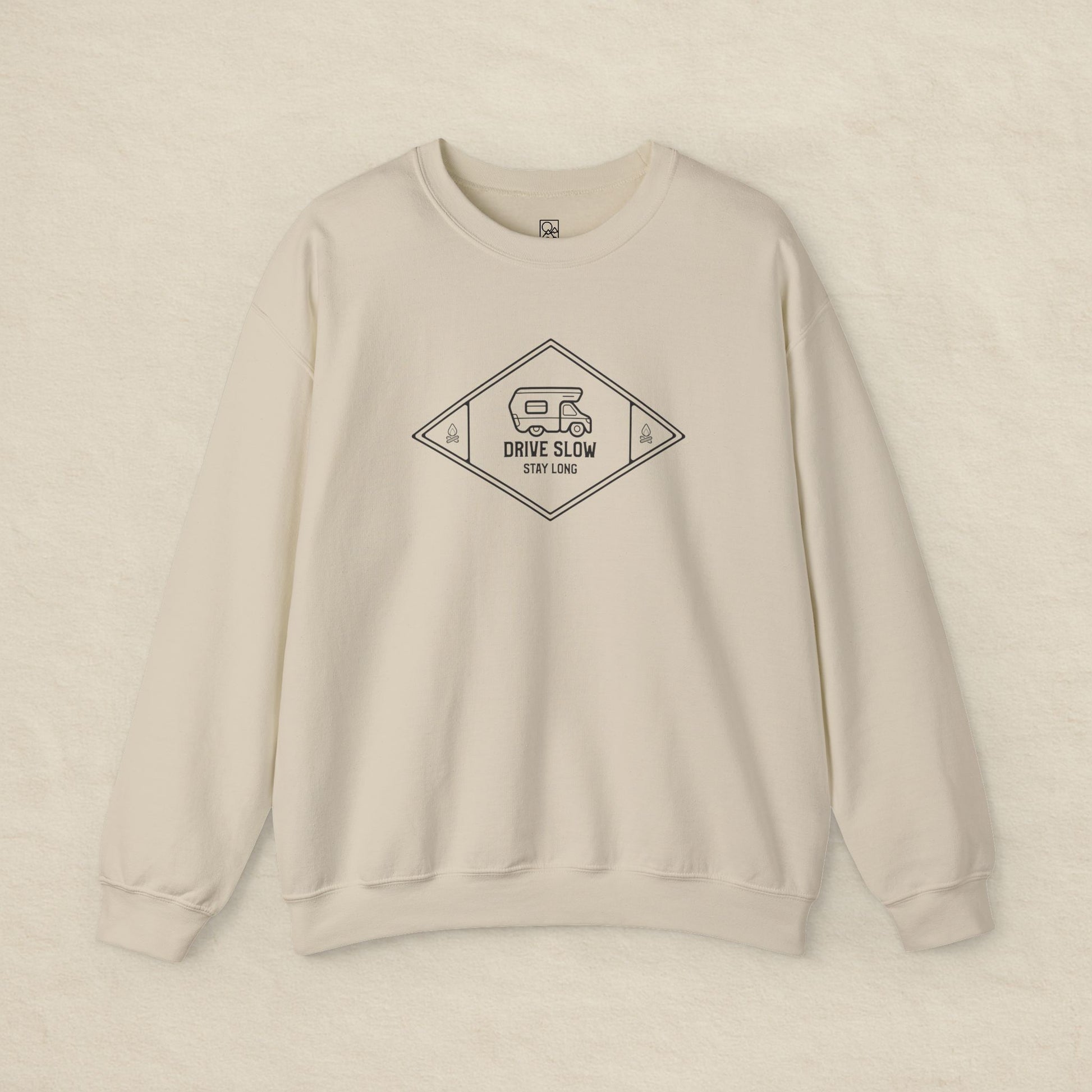 The Drive Slow, Stay Long sweatshirt features a clean line-art camper framed in a simple geometric badge — a gentle reminder to savor the miles, take the scenic roads, and give yourself time to breathe.