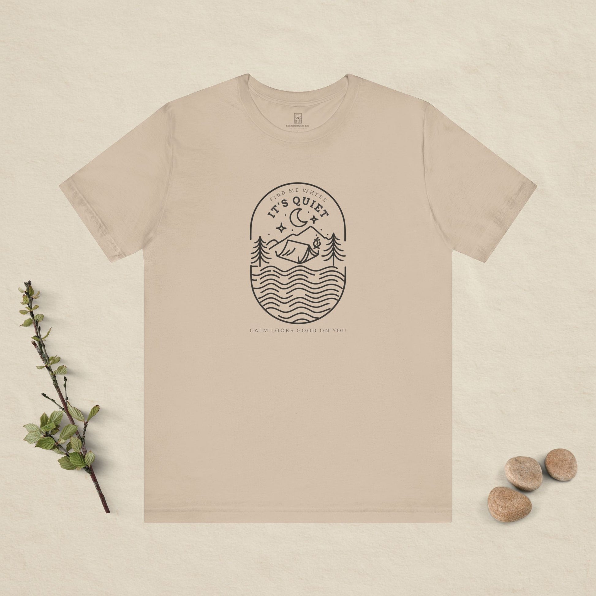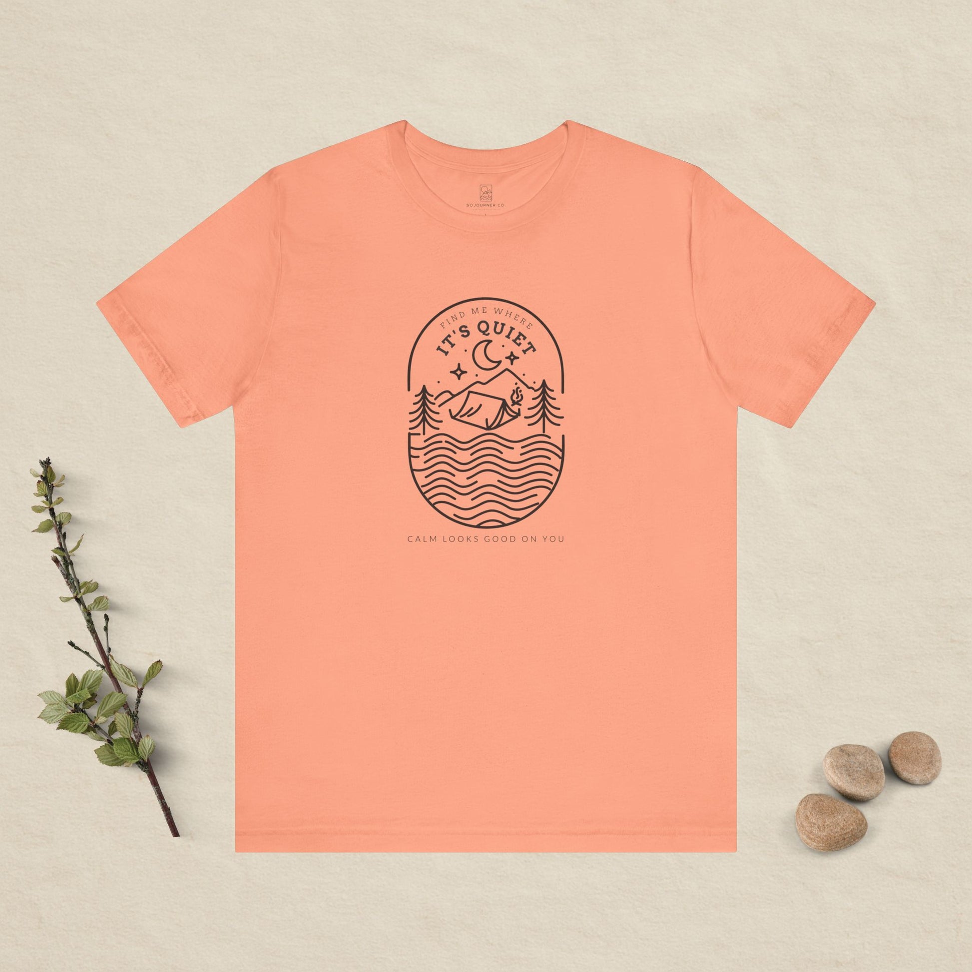 A peaceful escape, drawn in simple flowing lines. The Find Me Where It’s Quiet outline tee captures that calm moment beside the water — soft ripples, tall pines, a quiet tent under the moon. Minimalist but full of feeling, it’s a reminder to slow down and seek stillness.