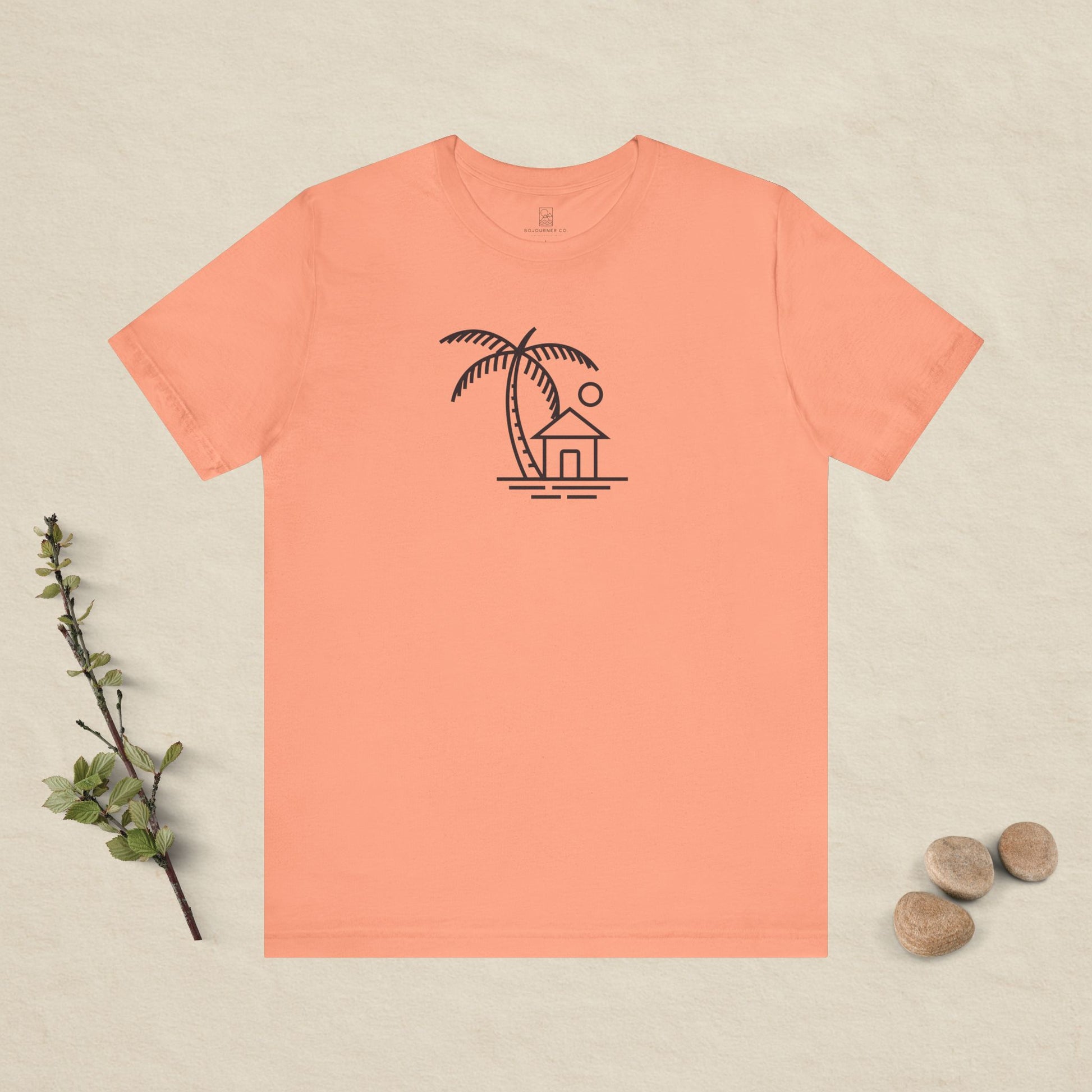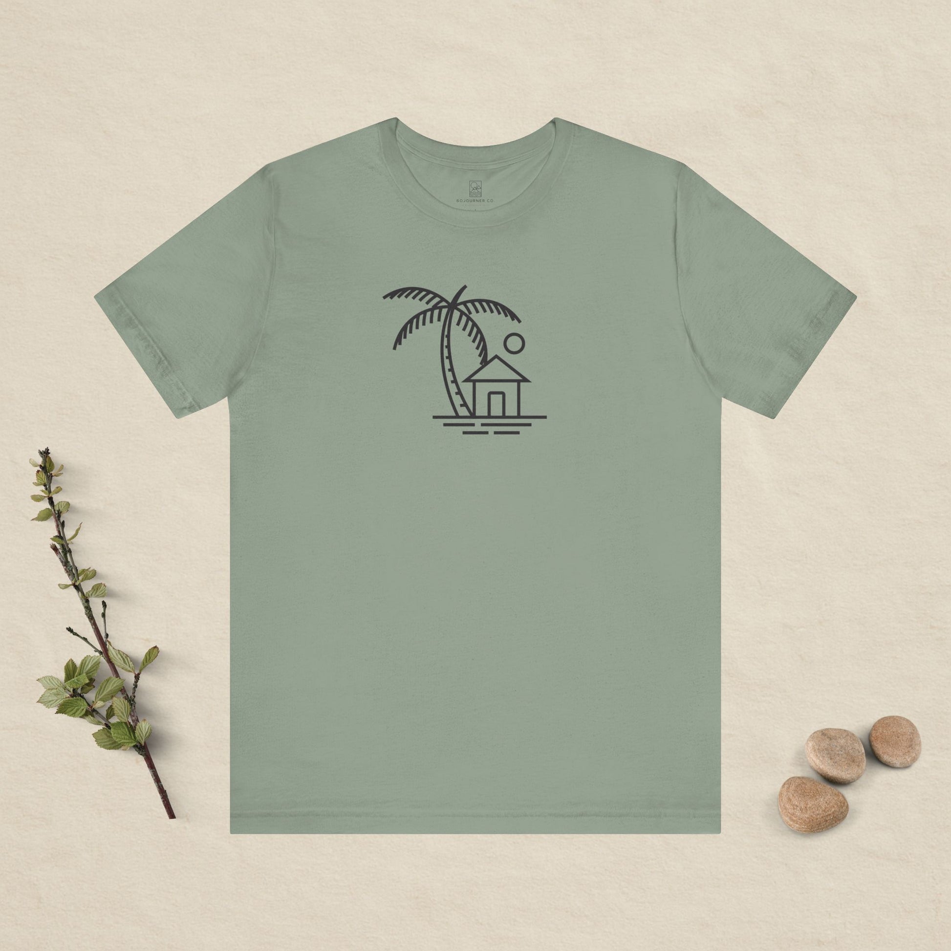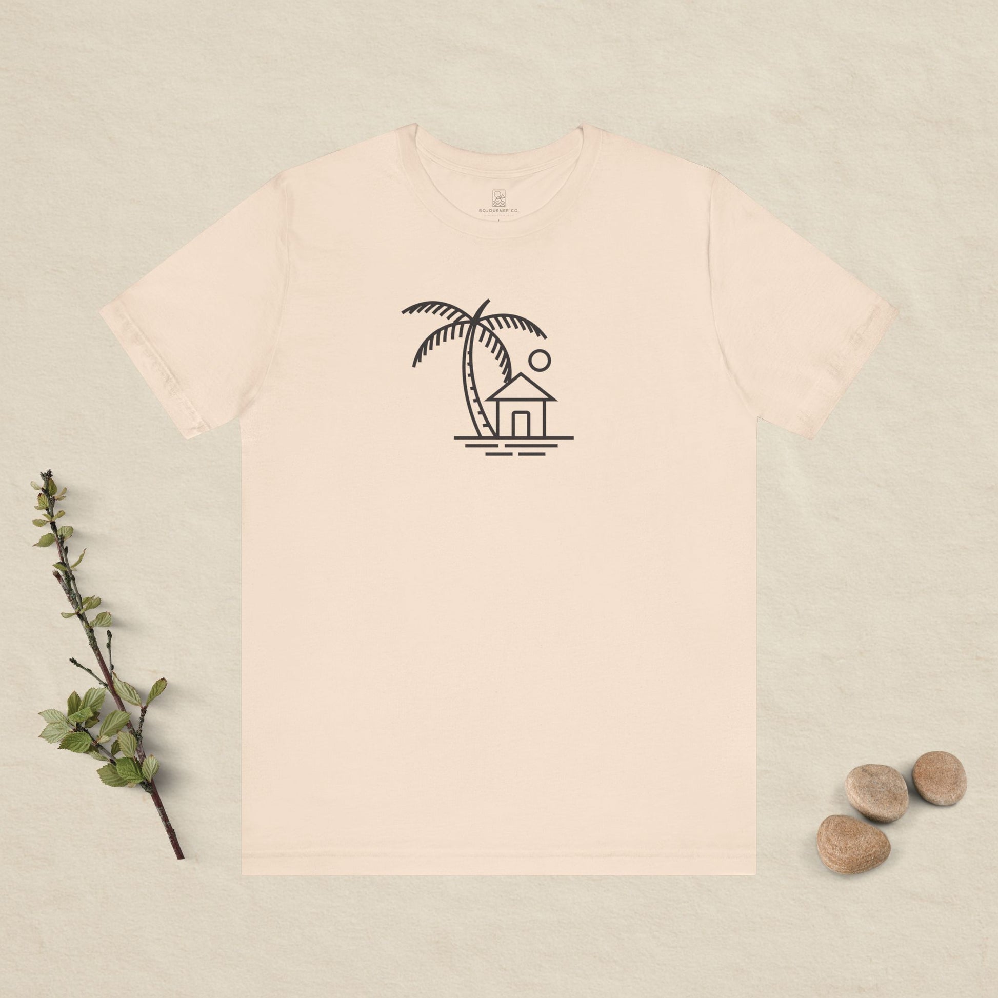Escape to a slower pace with this peaceful palm and beach hut design. A minimalist line illustration inspired by quiet coastal mornings and natural simplicity — perfect for those who seek calm in their everyday wear.