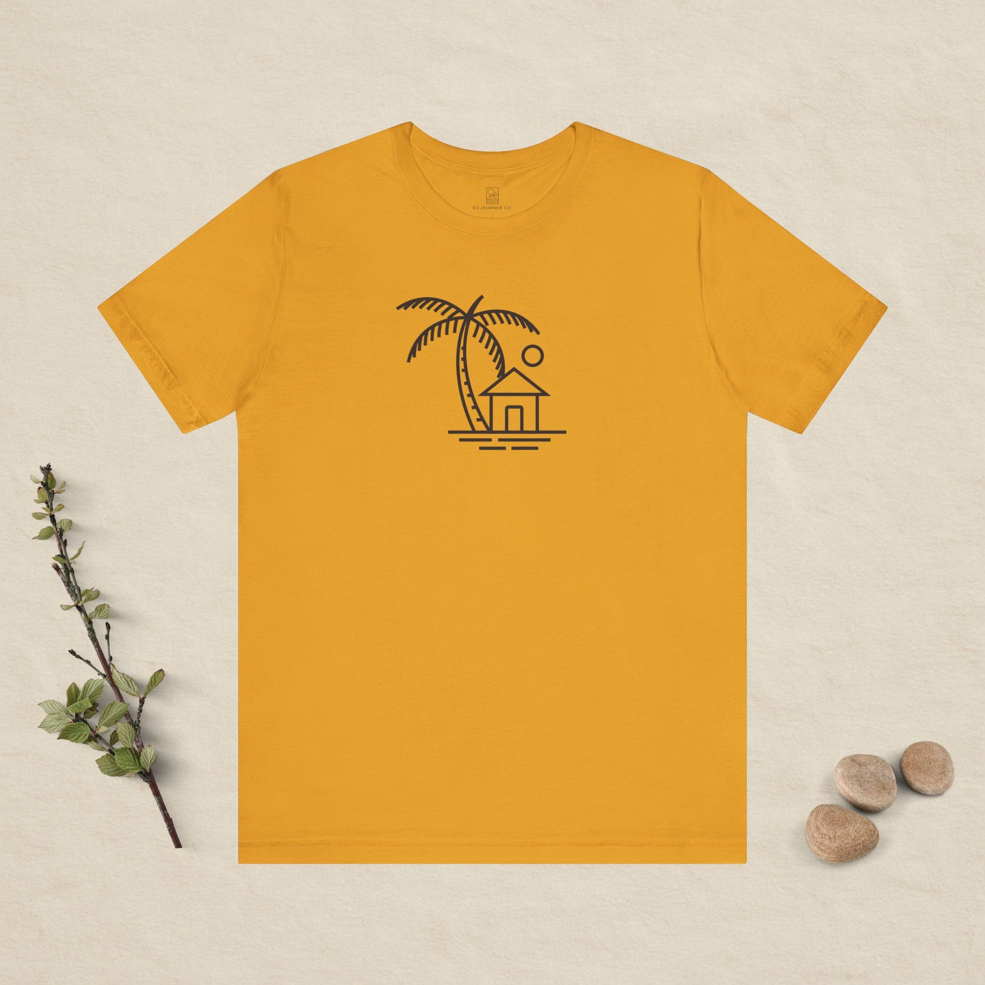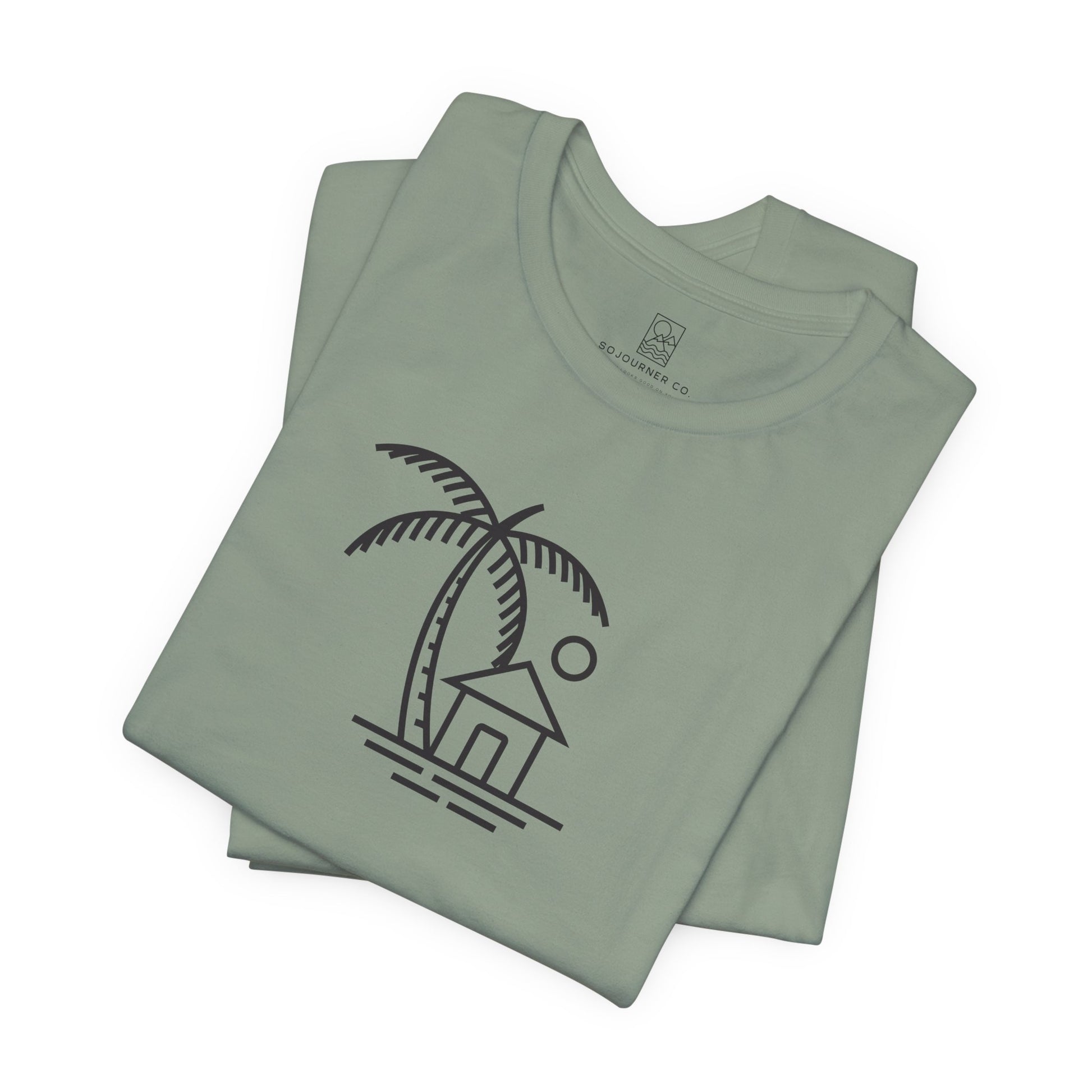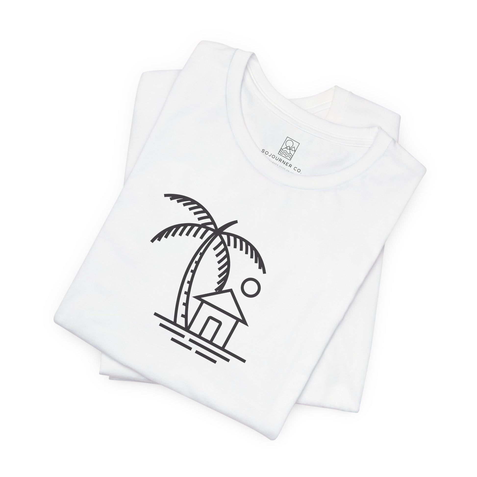 Escape to a slower pace with this peaceful palm and beach hut design. A minimalist line illustration inspired by quiet coastal mornings and natural simplicity — perfect for those who seek calm in their everyday wear.