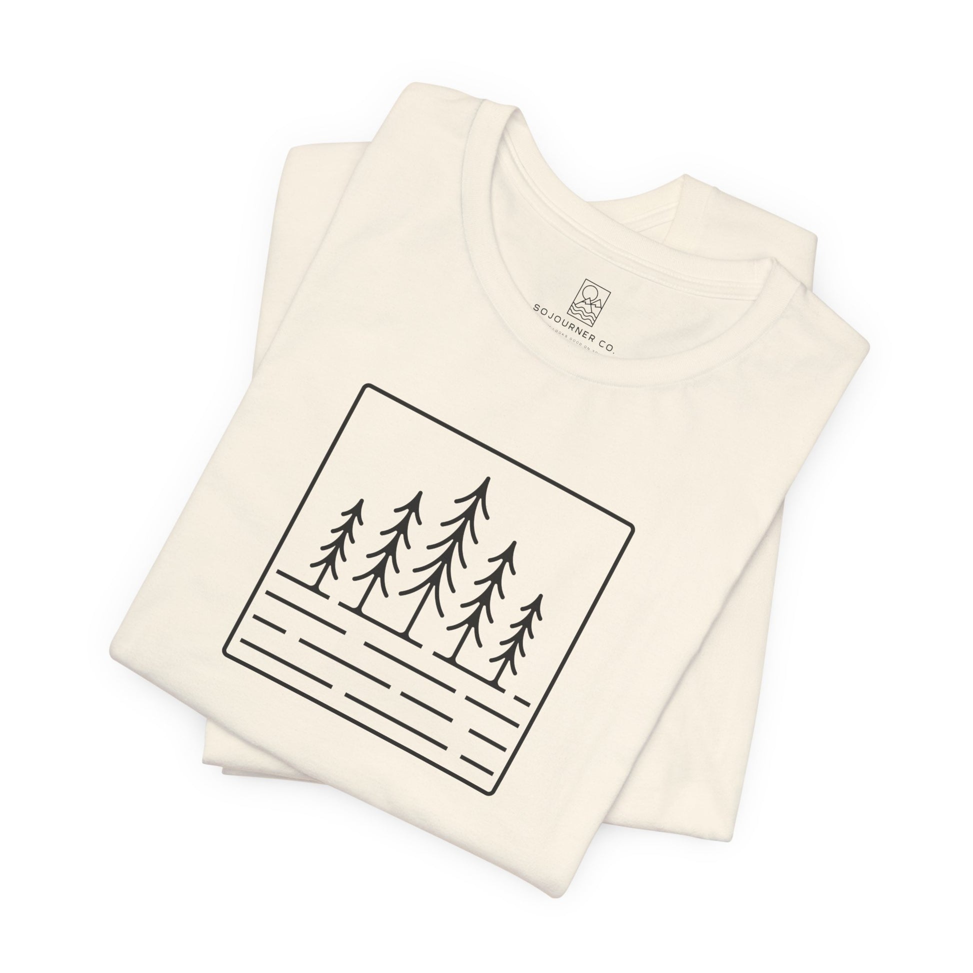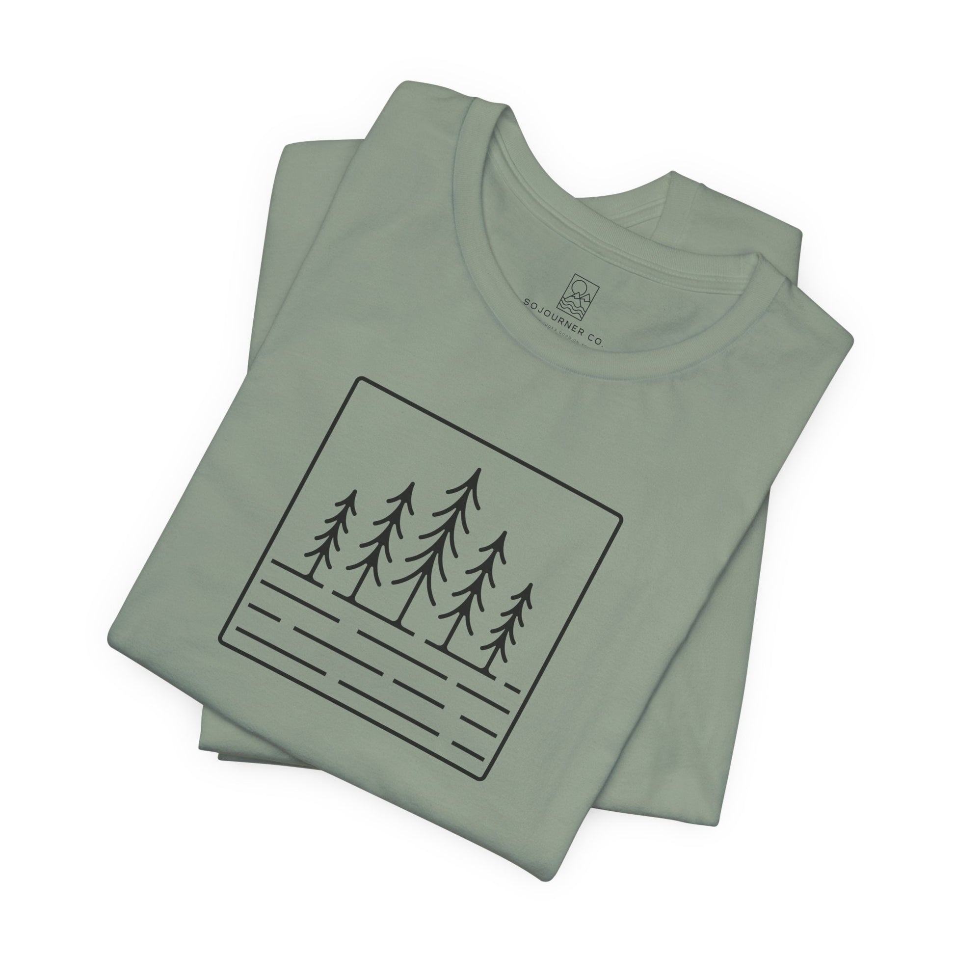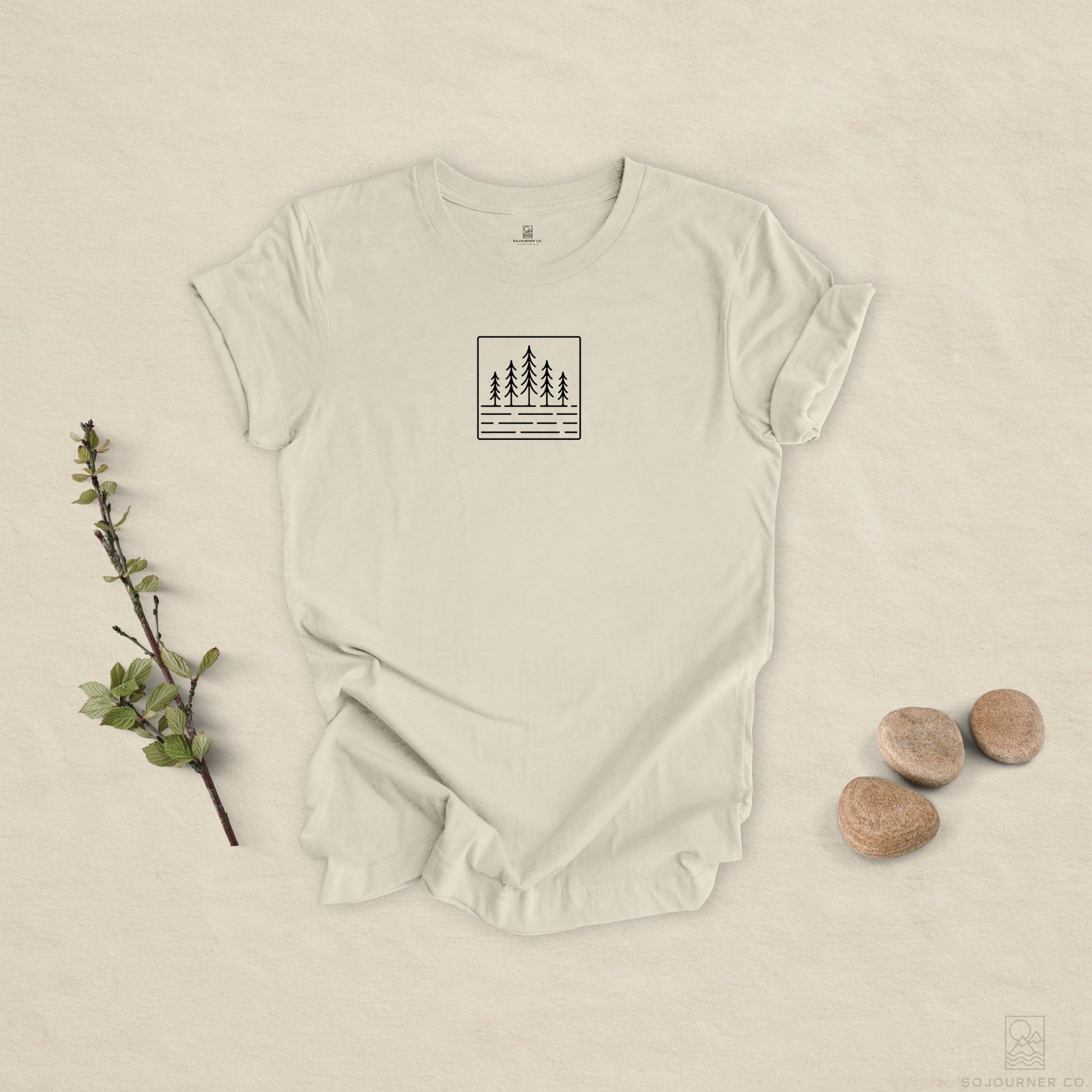 Stillness in symmetry. This design captures the quiet reflection of pine trees above a calm body of water — a simple scene with a deep sense of peace.