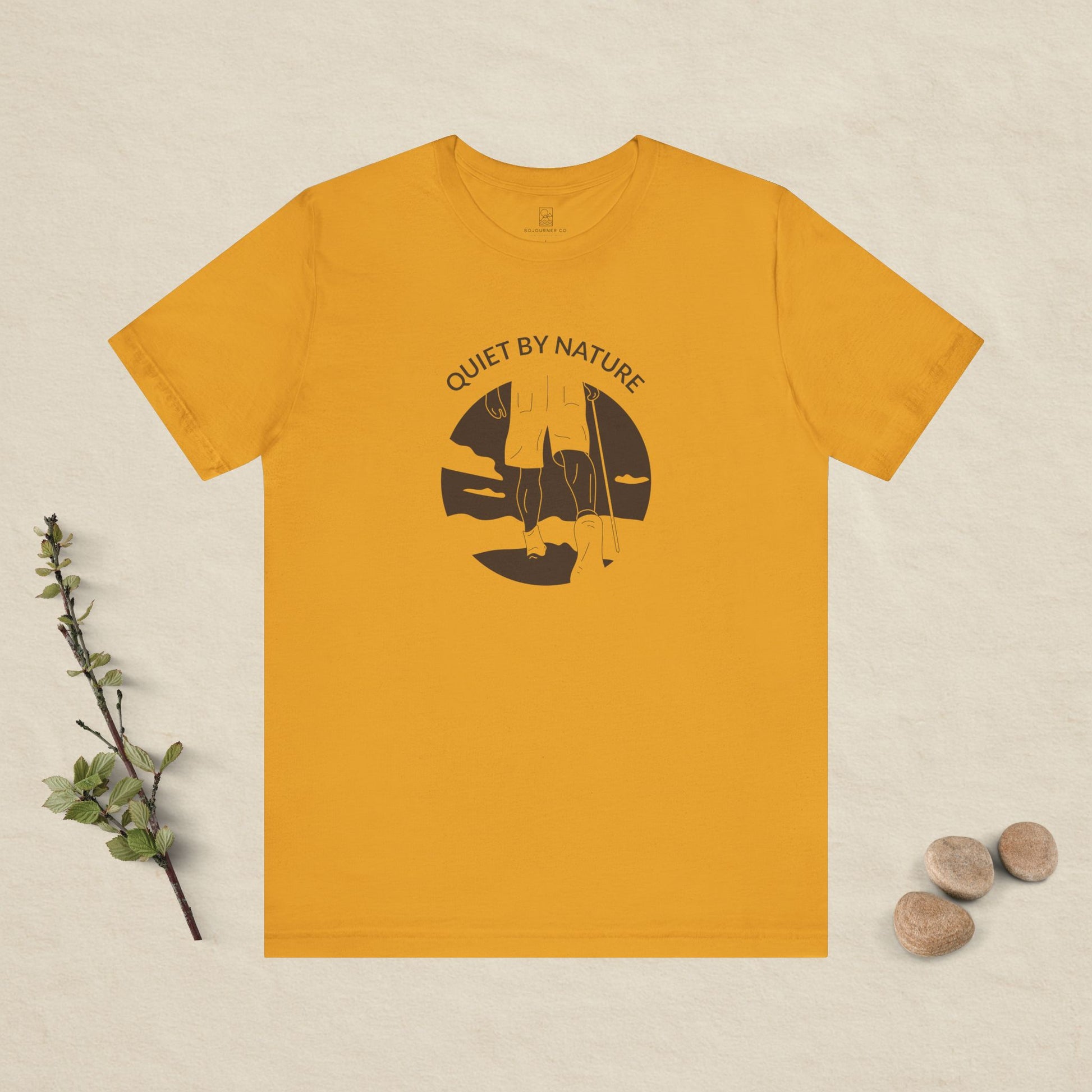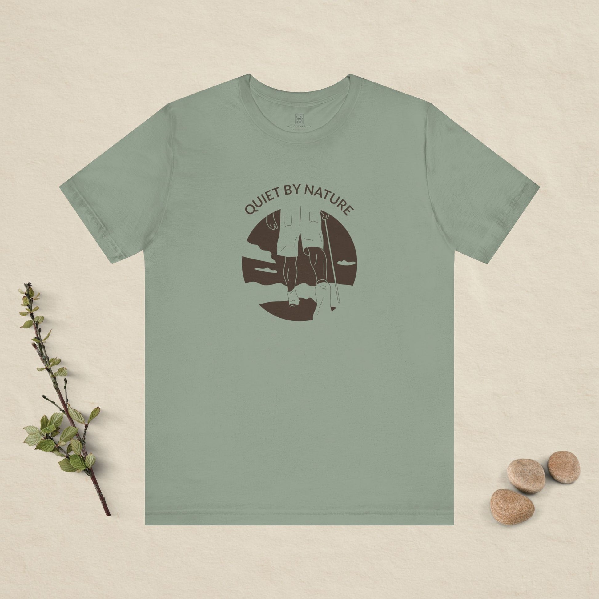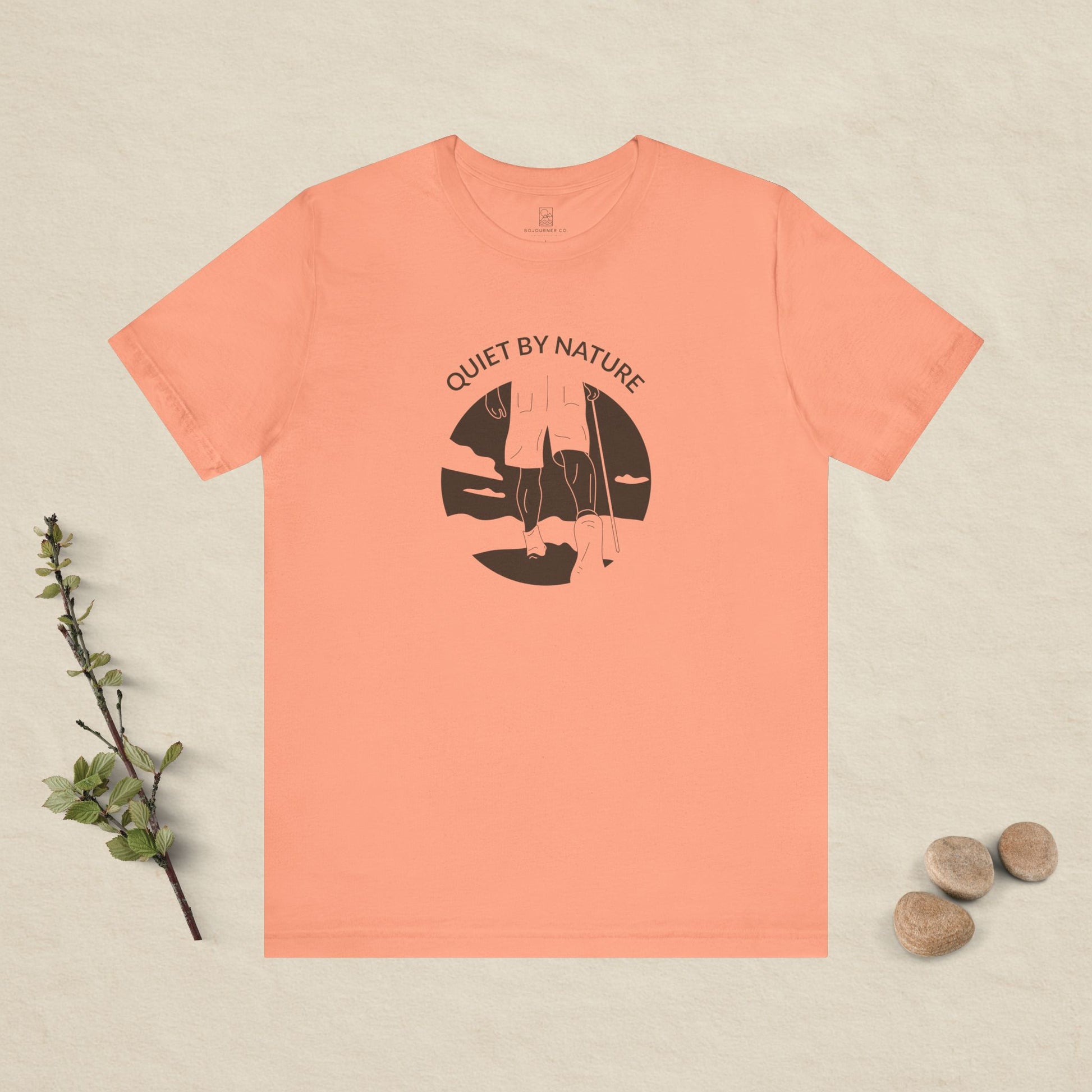 A gentle reminder to move at your own pace. The Quiet by Nature tee features a calm outdoor moment illustrated in soft, dark brown line art — a warm, earthy tone that feels grounded and natural.