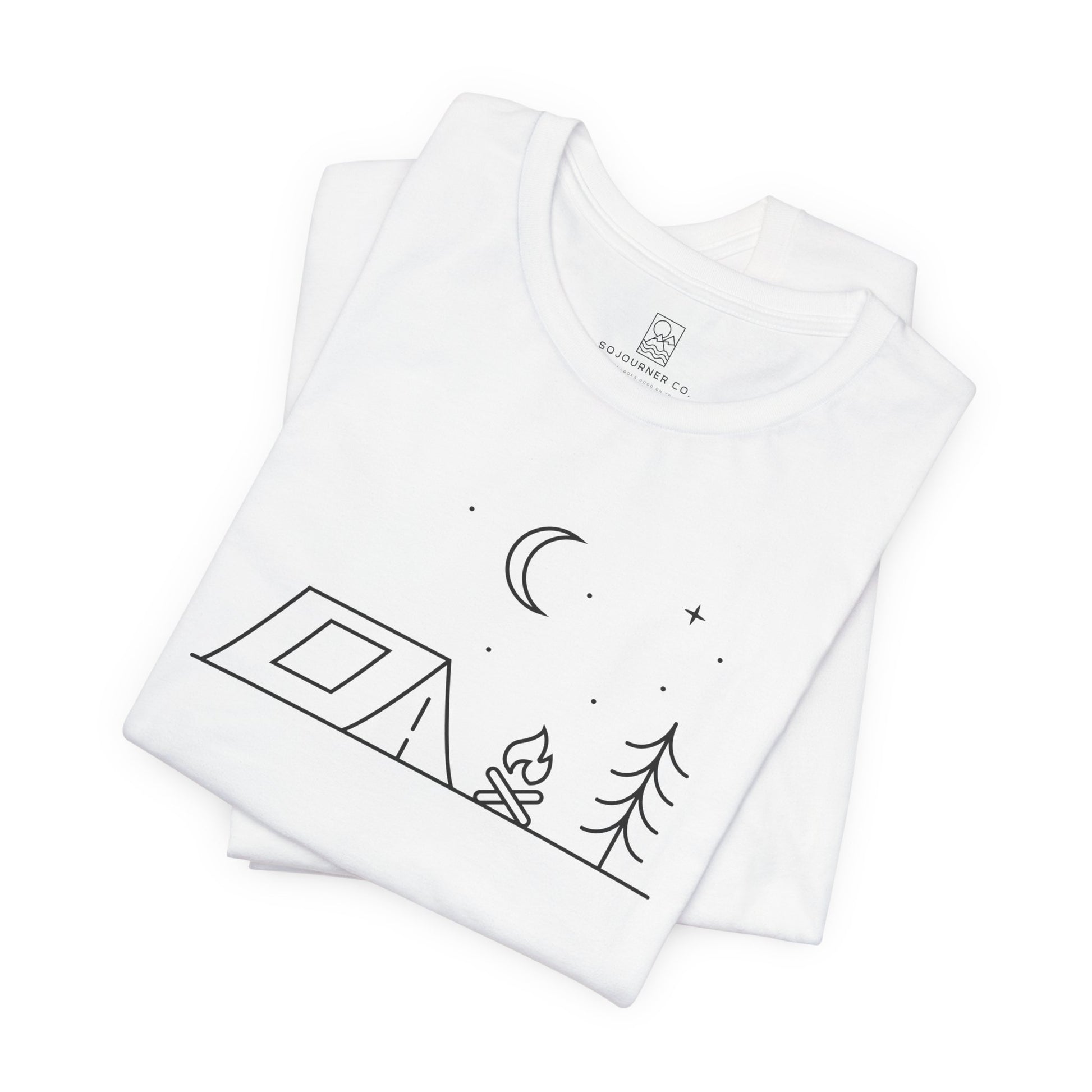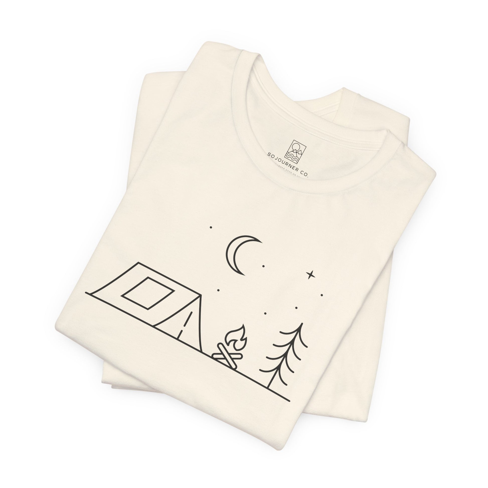This minimalist camping tee features a peaceful line drawing of a tent, campfire, pine tree, and crescent moon — for those who find their calm outdoors. It’s a reminder that adventure doesn’t have to be loud.
