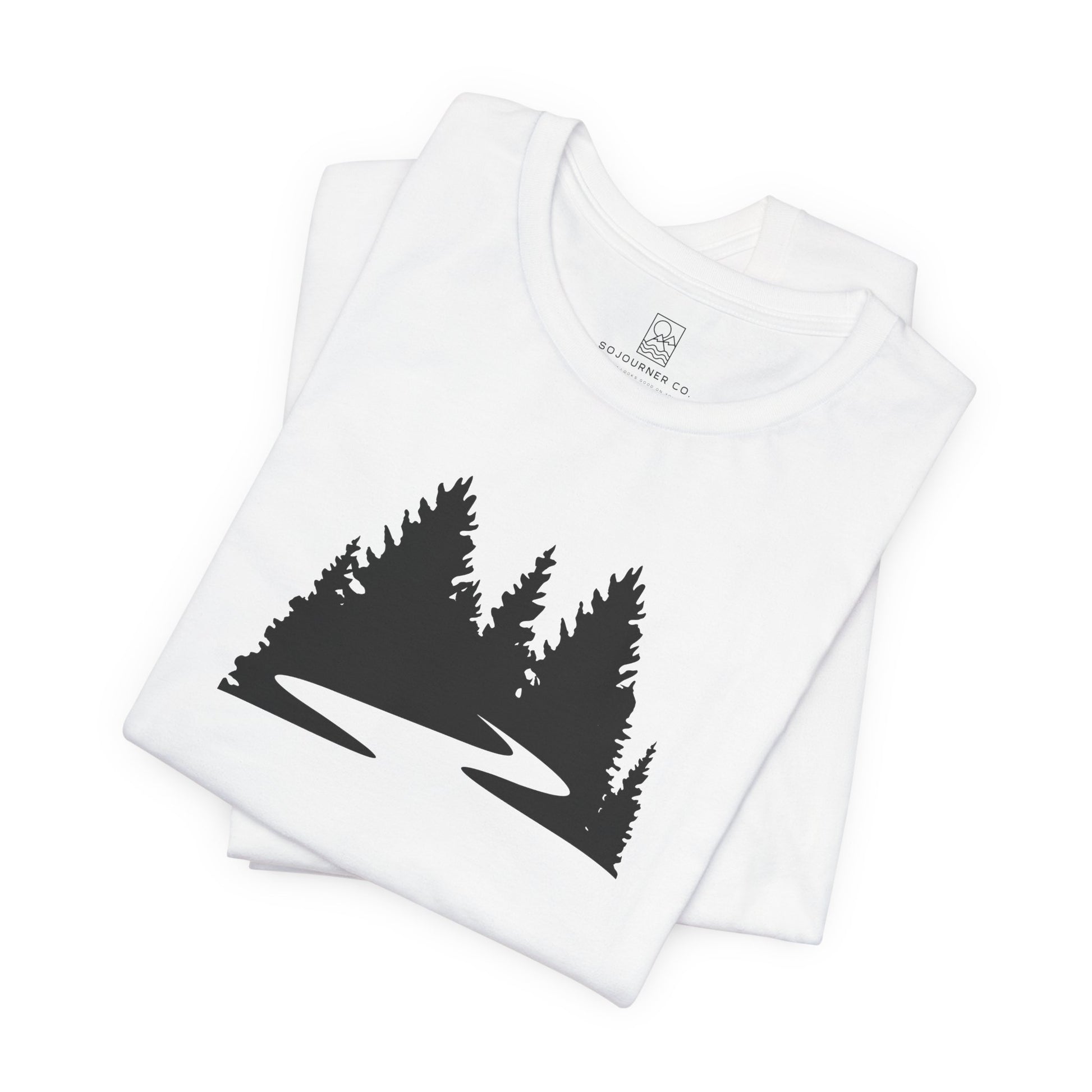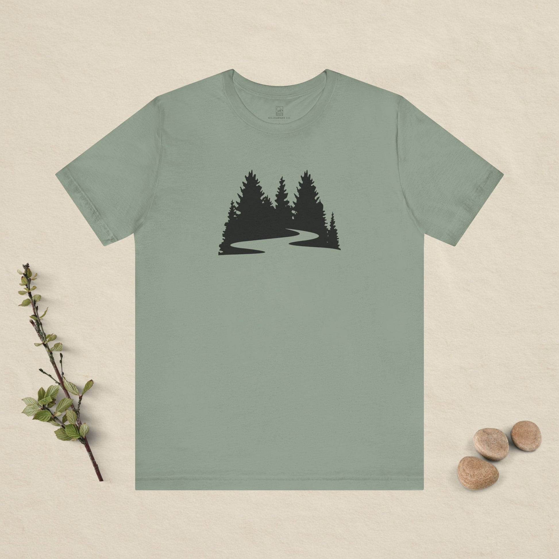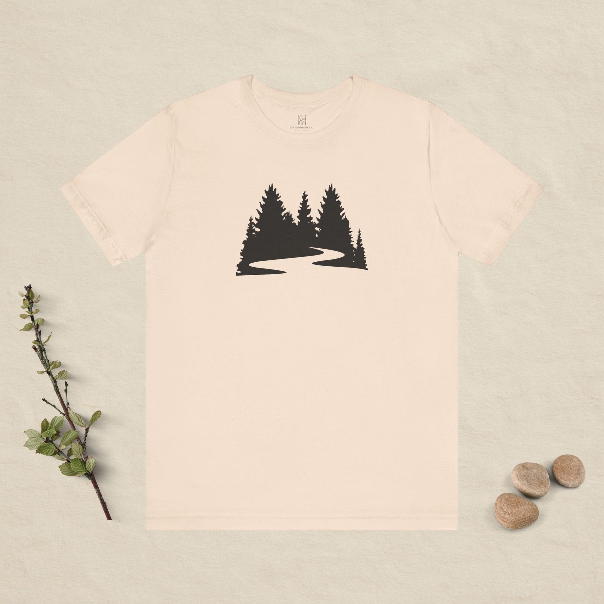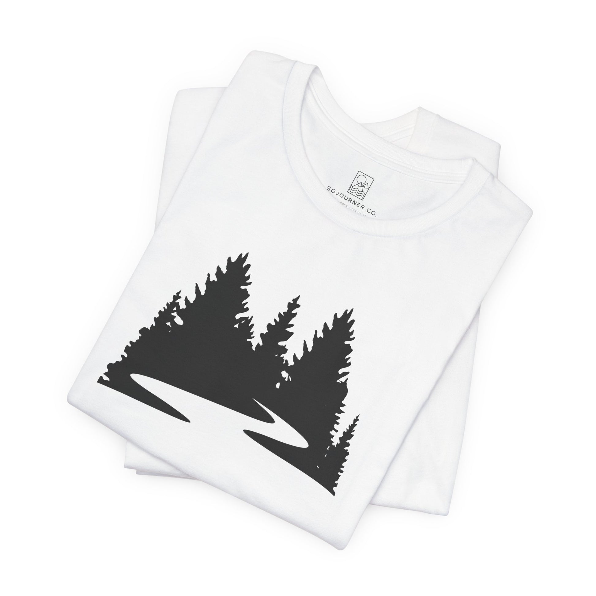 Follow the quiet curve of a winding forest trail in this bold, nature-inspired design. With high contrast and clean edges, this piece adds a grounded stillness to your wardrobe — a nod to slow paths and deep pine woods.